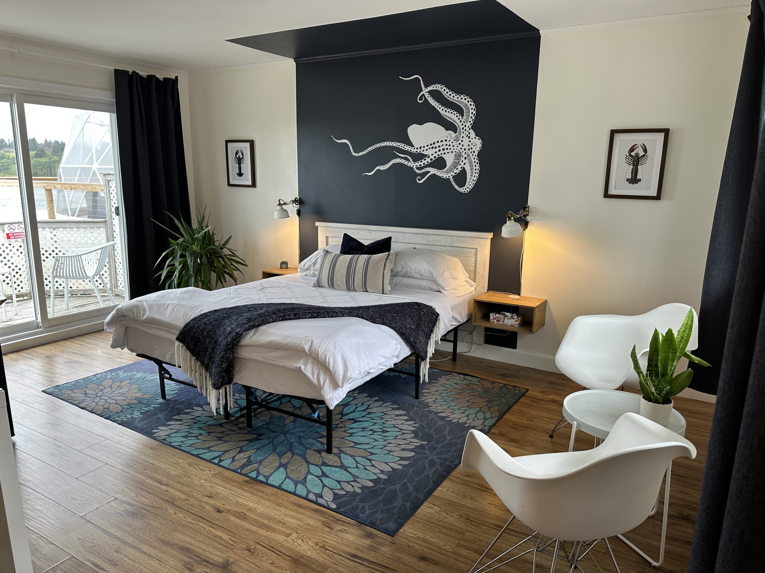 Outside there’s a barbecue, a fire pit and a hot tub. Those are the kinds of extras that turn a chill evening into a highlight. The location is ideal for exploring the Bay of Fundy – think tidal bore rafting and mud sliding nearby if you’re up for a tidal adventure.